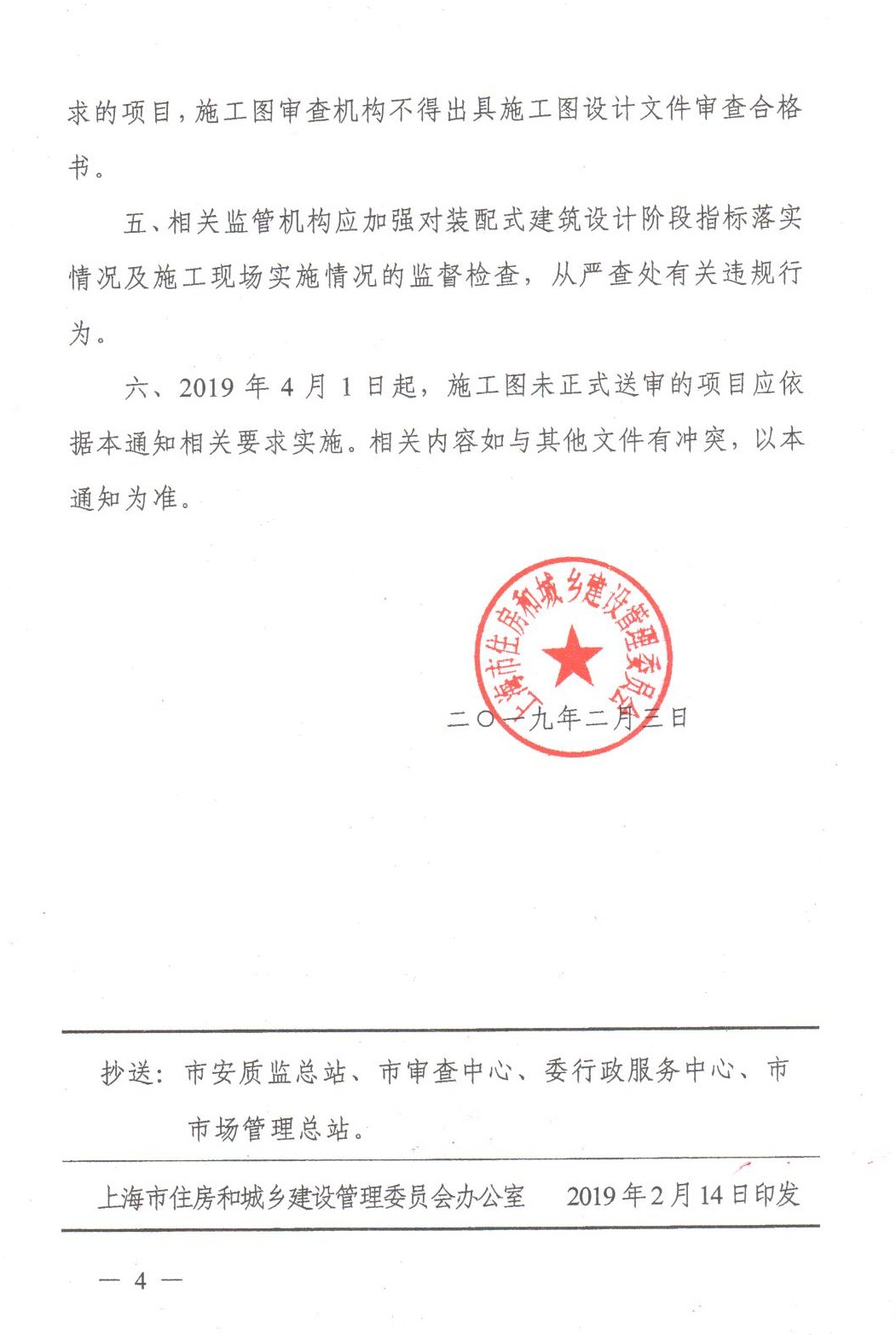 六、2019年4月1日起,施工图未正式送审的项目应依据本通知相关要求实施。相关内容如与其他文件有冲突,以本通知为准。