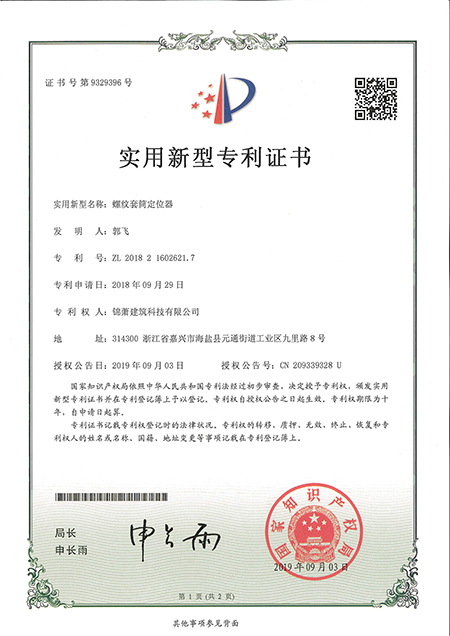 专利证书--螺纹套筒定位器